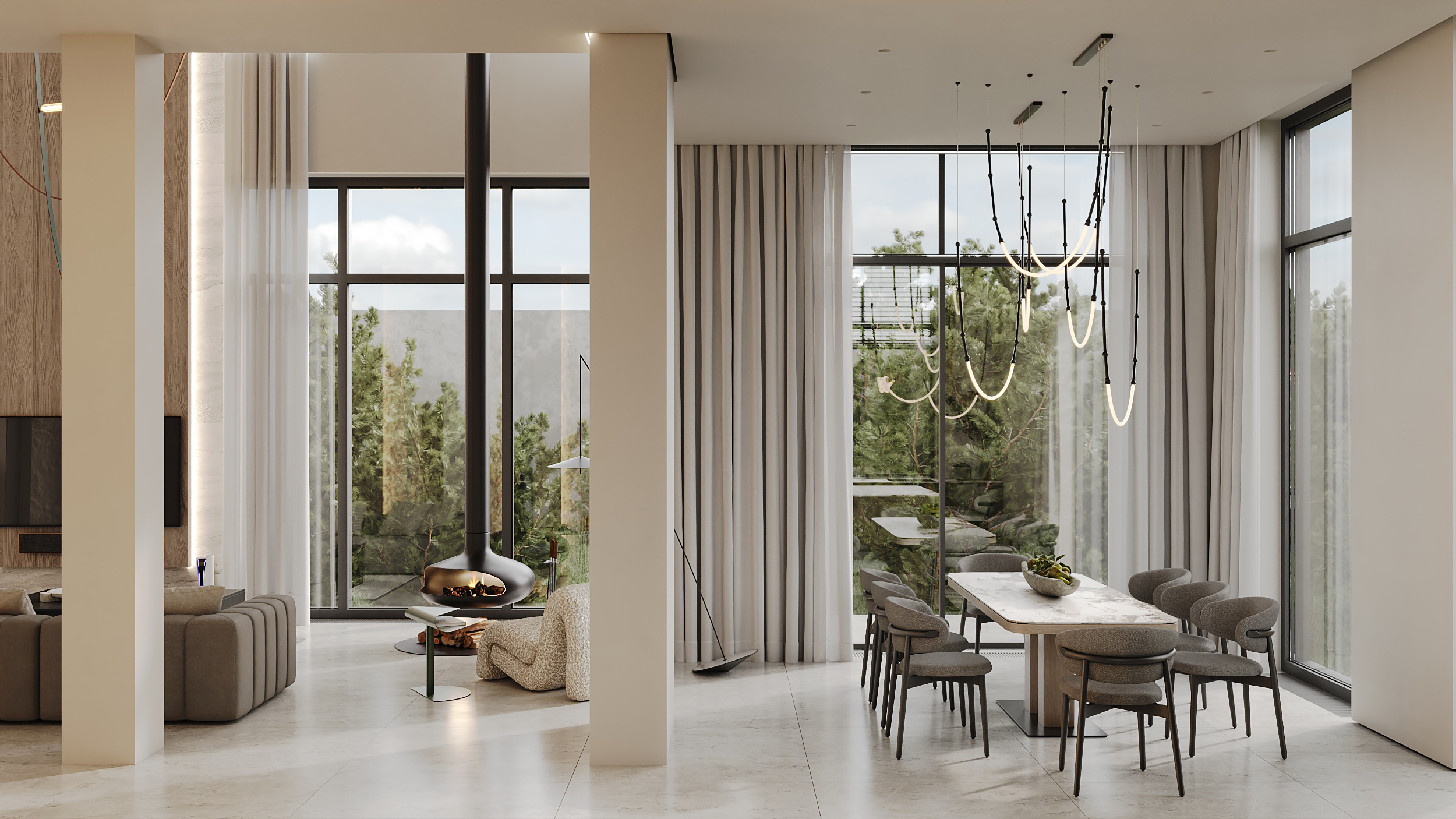 Пролёты, атмосфера, динамика света и движения удерживают внимание клиента.